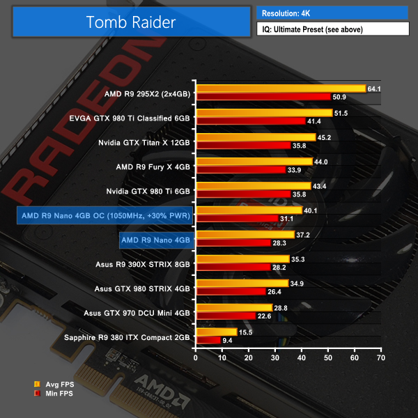 Tomb Raider has the R9 Nano slightly ahead of Asus' GTX 980 STRIX, although this result is close enough to be considered a draw. The R9 Fury X and GTX 980 Ti shows healthy performance leads over the similarly-priced R9 Nano.