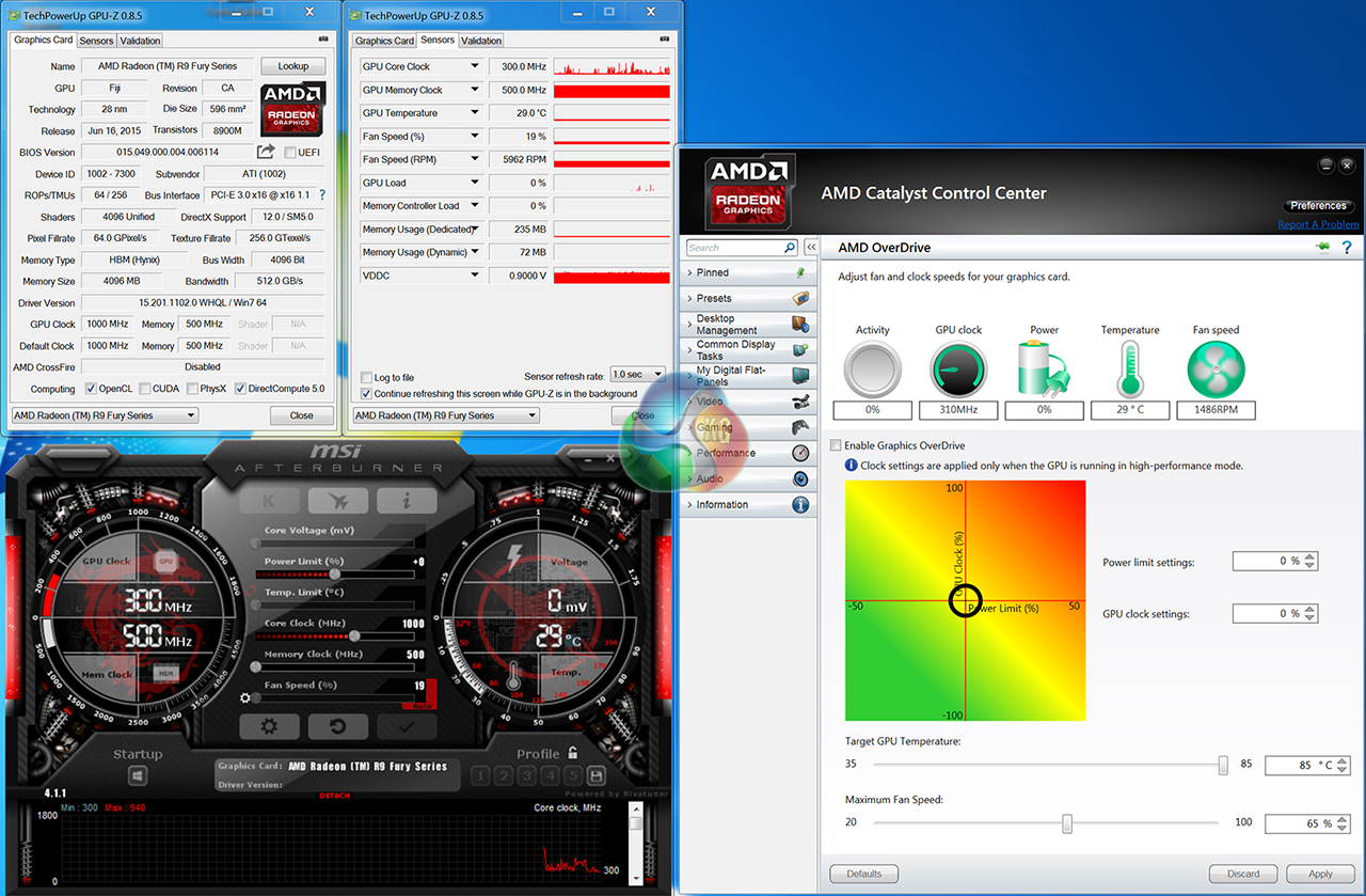On paper (or screen), AMD's R9 Nano shows up featuring a GPU core clock speed of 1000MHz. In reality, this figure is actually up to 1000MHz, meaning that the ASIC is capable of a Gigahertz but the PowerTune algorithms will decide the instantaneous GPU clock speed based primarily on power consumption and temperature factors.