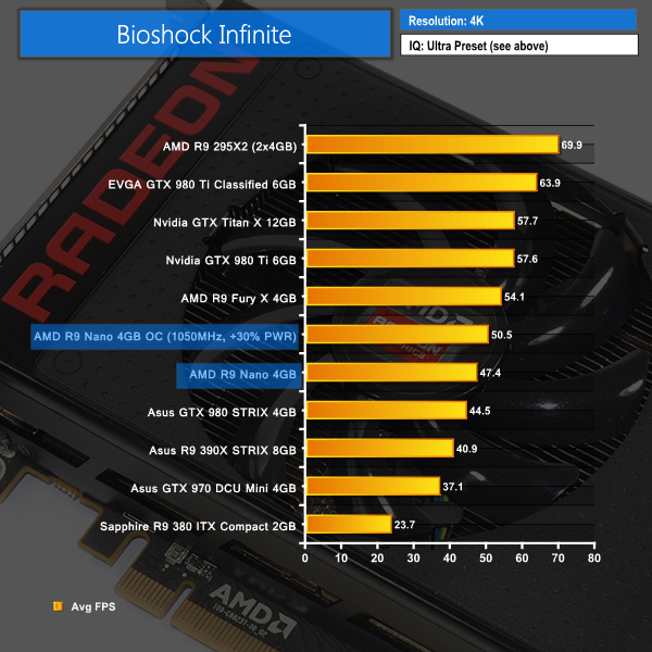 Bioshock Infinite is set to its highest image quality settings at both resolutions. We test a section of the game. In our previous graphics card review (of EVGA's GTX 980 Ti Classified) we removed the game's minimum FPS reading as our current test method seems to be imposing an unjustified penalty against AMD cards so we are looking into this issue. The same charting process is conducted for this review.