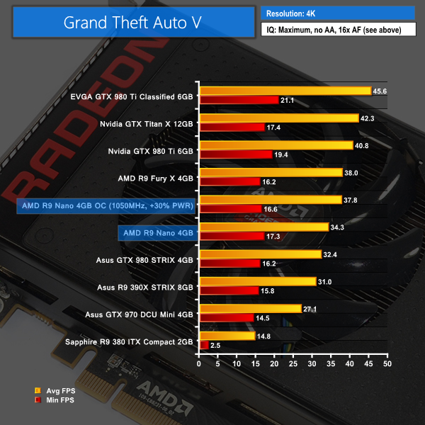 4K sees the Fiji-based R9 Nano outperforming the GTX 980. Given that these GTA V settings and the 4K resolution will happily use more than 4.5GB of VRAM, the R9 Nano seems to be enjoying some of the same benefits that the Fury X saw thanks to its high-bandwidth memory. GTA V seems to be allowing the 4GB frame buffer to use its speed as a way of alleviating the higher VRAM usage that other graphics cards were hit with.