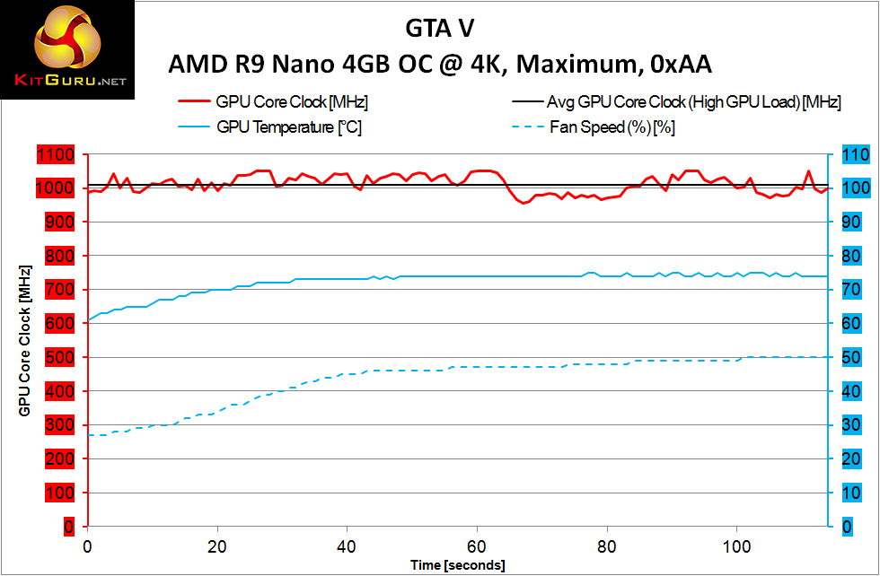 GTA V was one of the more positive game engines when it comes to allowing the R9 Nano's GPU core clock to flex its speed. At 1440P the R9 Nano was able to hit its 1GHz maximum core clock and the average reading was in the high-900MHz range. 4K also saw the card run at an average core clock of more than 900MHz.