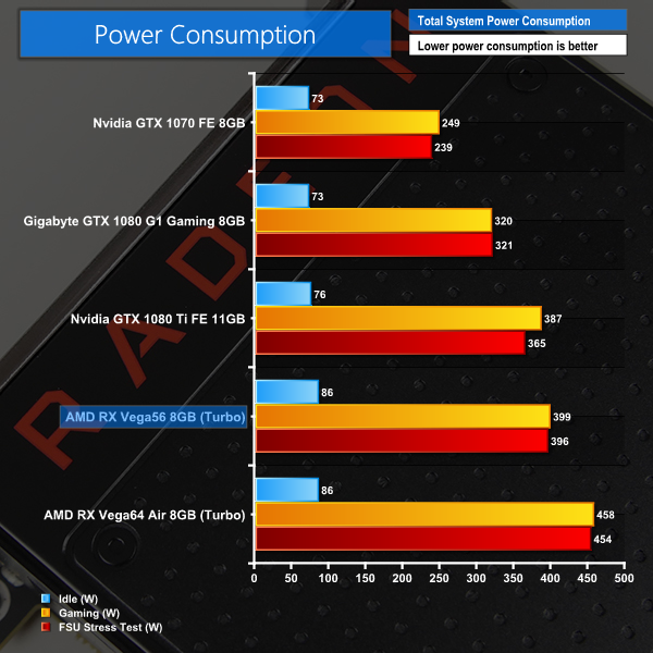Power efficiency is clearly not a strength for AMD's Vega GPUs. The RX Vega56 operating in its ‘Turbo' power mode (which prioritises performance above all else) pulls more power than the vastly superior GTX 1080 Ti. Nvidia's efficient GTX 1070 FE uses around 150W (38%) less power when gaming at 4K though it also offers generally lower performance.