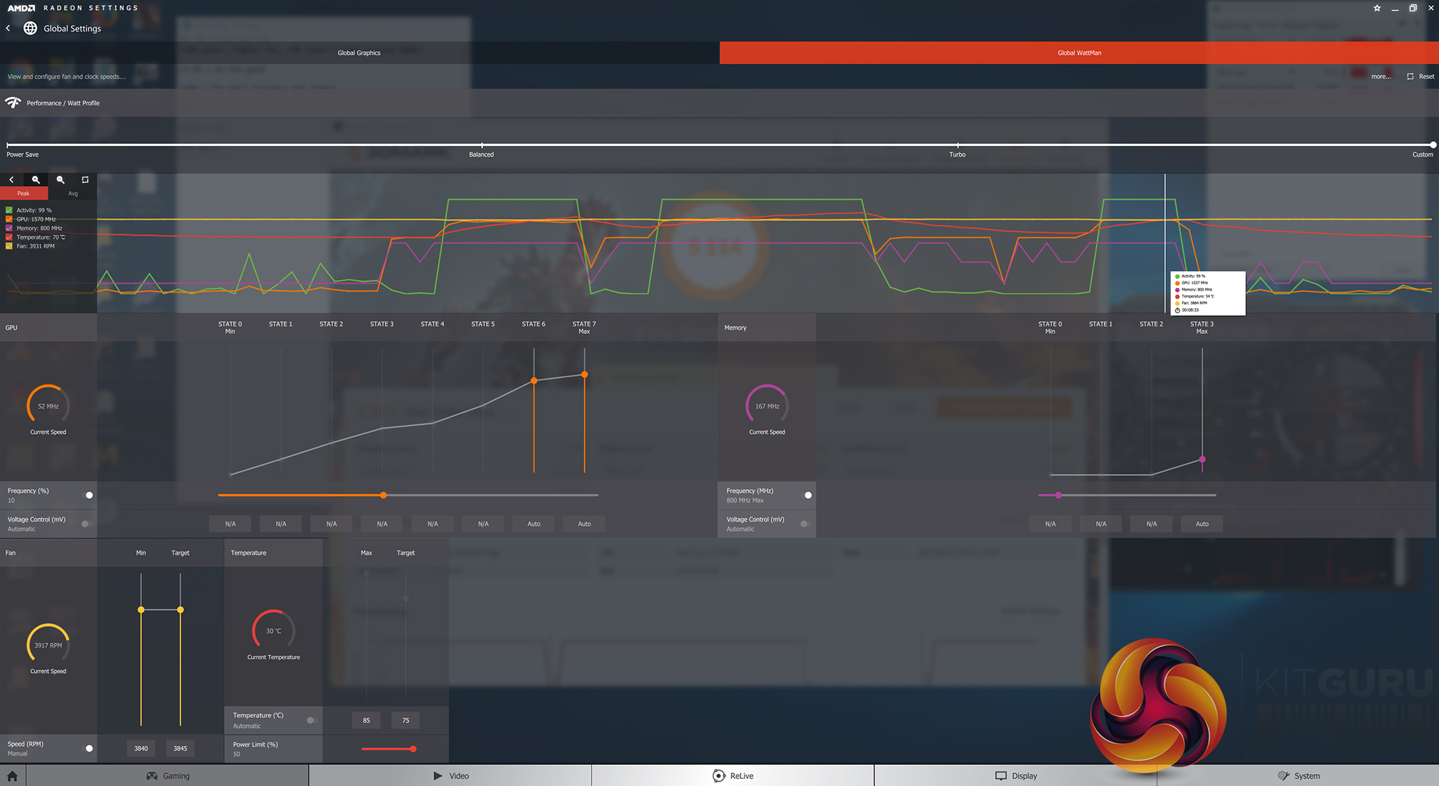 We started our brief overclocking session using WattMan by increasing the power target to 50%, setting the fan to around 78%, and using default voltage. This allowed us to hit a frequency increase of 10% with stability.