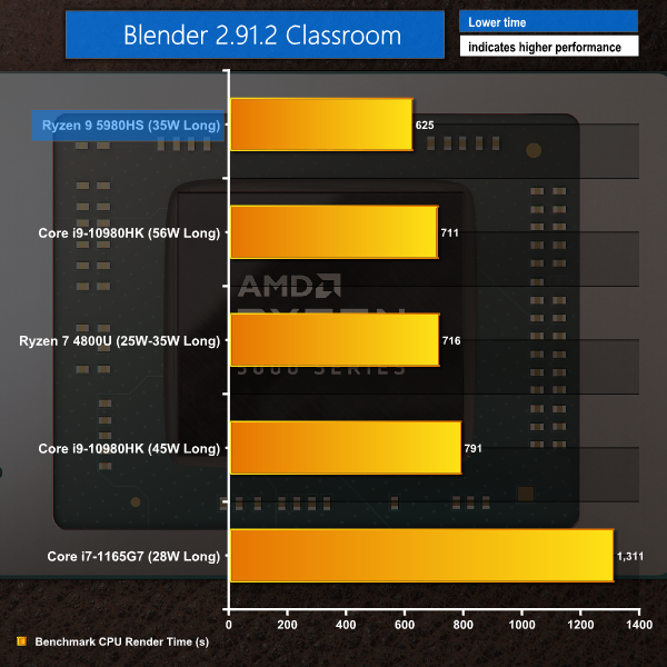 The Blender Classroom test and its longer runtime gives us a good look at performance after the processors’ initial high power and frequency surges. We still see AMD’s 5980HS out in front by an increasingly comfortable margin thanks to the clock speed proficiency at 35W steady state package power which sees all 8 cores running at 3.3GHz.