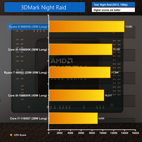 3DMark Time Spy has the Ryzen 9 5980HS as the highest chip in our chart for CPU scoring. This comes as no surprise given the use of proficient, highly clocked Zen 3 cores. Night Raid shows the same trend, though this less demanding workload widens the Ryzen chip’s lead over the Core i9-10980HK.