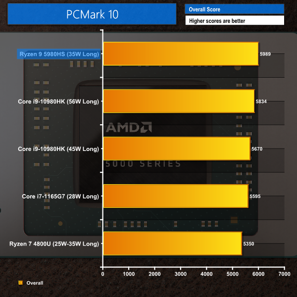 Overall scoring from PCMark 10 has the Ryzen 9 5980HS-equipped Flow X13 laptop in first place. Digging deeper into the individual test results, we see the Ryzen 9 performing particularly well with productivity tasks. Though Intel’s competitors do put up a good fight thanks to their acceleration capabilities from features such as QuickSync and stronger partnering GPUs in the case of the MSI and Razer laptops.