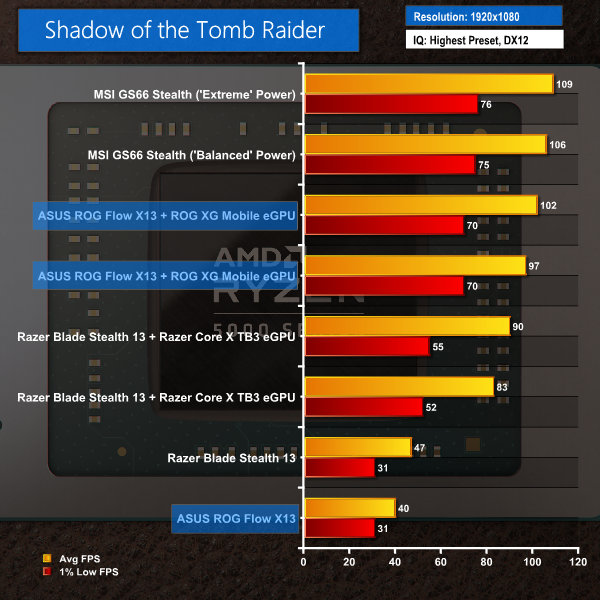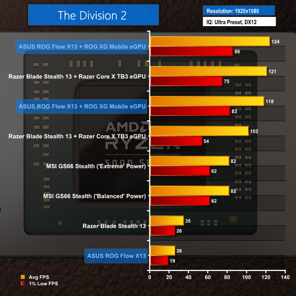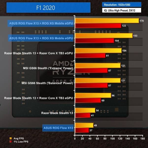 Performance from the Ryzen 9 5980HS-powered solution with the XG Mobile dock is very hit or miss. There are clear signs of the Ryzen chip's gaming prowess, as highlighted by the RTX 3080 Laptop GPU inside the ASUS dock often outperforming the desktop-class RTX 3080 in the Razer competing solution. This is not only down to bandwidth benefits on the ASUS solution, but also the more powerful Ryzen 9 5980HS CPU that does not bottleneck the GPU.