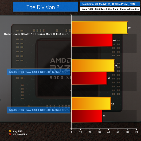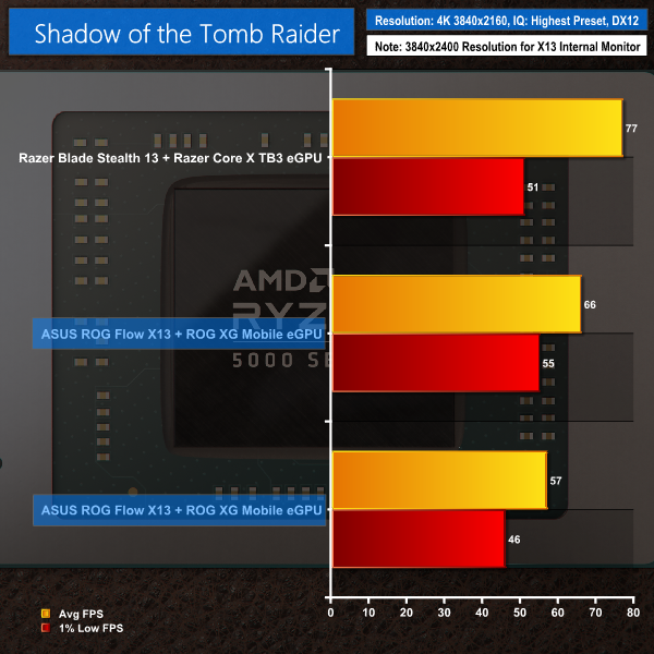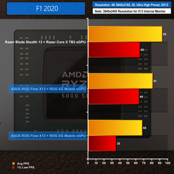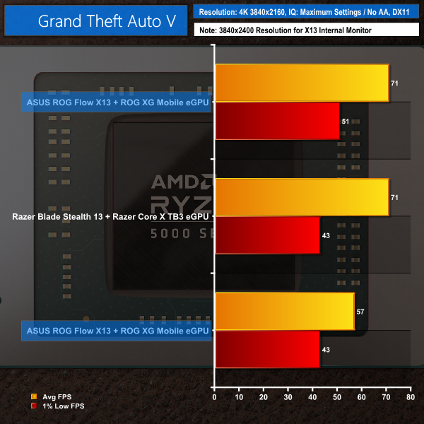We test at 4K resolution to see if the higher strain placed on the GPU shows any differences between the solutions and whether the Ryzen 9 5980HS can plug that gap. For the Razer 1080p laptop, we use an external 4K display. And for the Ryzen-power ASUS Flow X13, we use the 4K 3840×2160 external display as well as the internal laptop monitor which forced a slightly more demanding 3840×2400 16:10 resolution.