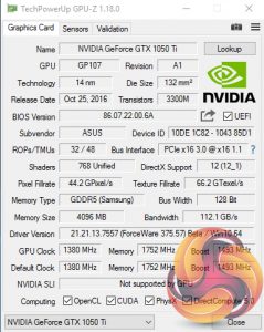 The ASUS ROG STRIX GTX 1050 Ti OC operates at 1380MHz core clock and 1493MHz boost frequency, out of the box in its default Gaming Mode. These are increases of 90MHz and 100MHz, respectively, over Nvidia's reference frequencies. Memory speed is left unchanged at 7008MHz effective.