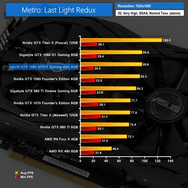 Similar performance is shown between the ASUS and Gigabyte GTX 1080s in Metro: Last Light Redux, with both cards being around 1-3 FPS faster than the GTX 1080 FE.