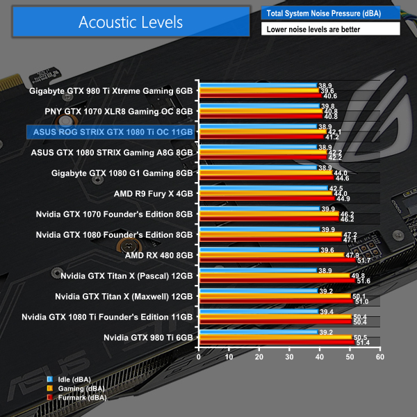 As was the case for thermal performance, noise emission results for ASUS' triple-fan cooler are superb. ASUS' card is noticeably quieter than the GTX 1080 Ti Founder's Edition when running a game. At 33% fan speed (the Furmark level), the STRIX cooler was hard to distinguish above the background noise of our Corsair H110i GT AIO's pump.