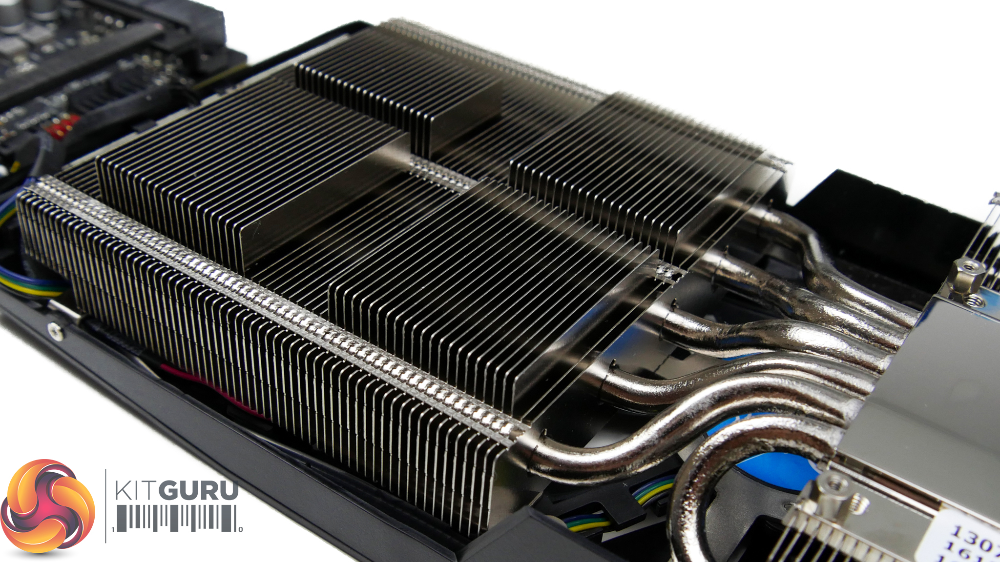 Weighing almost 1.3kg, this card is a perfect example for the uptake in strengthened PCIe x16 slots on modern motherboards. If you plan on shipping a system with this beast installed, I would advise caution. Thankfully, ASUS uses a custom PCB brace and a backplate which, combined with the mounting point for the heavy GPU cooler, should help to mitigate PCB sag.