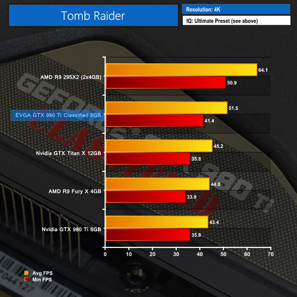 Tomb Raider's stable, consistent game engine continues the performance trend. At 4K, the EVGA GTX 980 Ti Classified out-muscles a reference GTX 980 Ti by almost 19%.