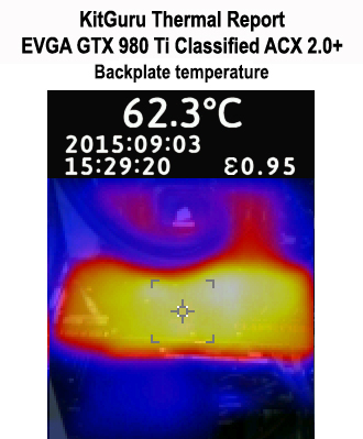 A temperature difference of less than 10°C between the hottest and coolest parts of the backplate speaks volumes for the superb effectiveness of EVGA's design. And a maximum hot-spot temperature of 66°C (behind the power delivery MOSFETs) is no cause for concern, even if cables or cooler tubing are in physical contact with the area.