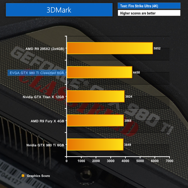 EVGA's factory-overclocked GTX 980 Ti makes a strong start in the 3DMark tests. A combination of the higher core- and boost-clock speeds, as well as enhanced cooling capacity which alleviates thermal throttling worries, gives the EVGA GTX 980 Ti Classified a 16% performance increase over Nvidia's reference board for 3DMark's 4K test.