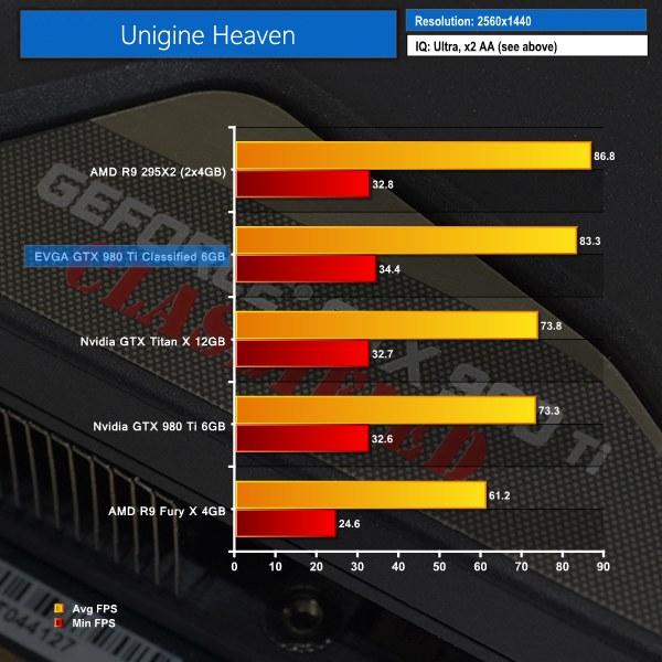 AMD's venerable R9 295X2 takes top spot in Unigine's Heaven benchmark, but the heavily overclocked EVGA GTX 980 Ti board is hot on its heels.