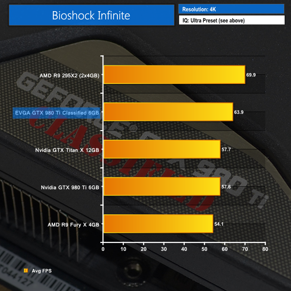 More of the same is shown in Bioshock Infinite. The custom-cooled, factory-overclocked EVGA board fights its way into a distinct second place, sitting between the dual-GPU R9 295X2 and Nvidia's flagship Titan X board.