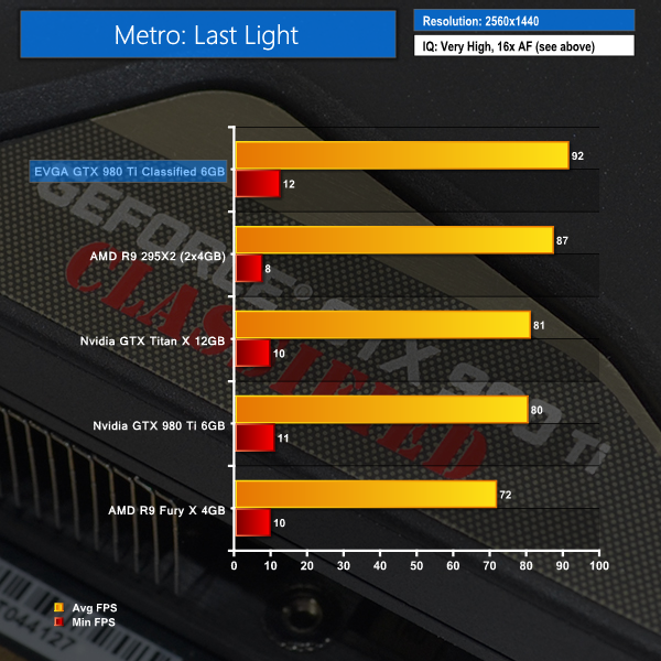 Metro: Last Light seems to be showing a clear preference for Nvidia hardware by positioning the dual-GPU R9 295X2 below the performance of EVGA's overclocked GTX 980 Ti. This is most likely related to a recent driver or game software update.