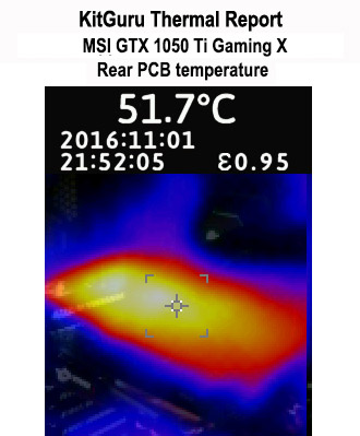 Thanks to its low power consumption, the MSI GTX 1050 Ti Gaming X doesn't get particularly hot on the PCB areas. The hottest section is directly behind the VRM components, but even after 40 minutes of a Unigine Heaven 1080p loop, the area stays below 60°C. A backplate is not required to aid this card's cooling performance.