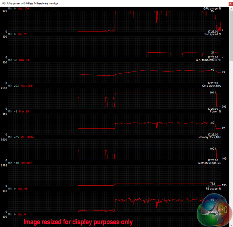 Memory was overclocked by 250MHz to 8Gbps effective. The power level was set at 125% using MSI Afterburner in order to ensure sufficient power was sent to the GPU.