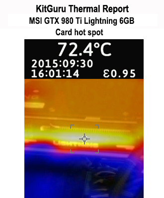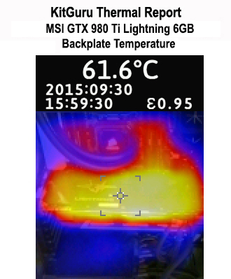 Despite not making direct contact with the card's PCB, MSI's backplate seems to be spreading the heat quite effectively. We detected a hot spot on a thick metal section of the cooler close to the Lightning logo. Good results.