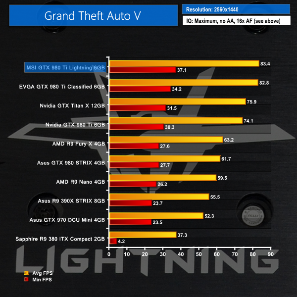 We set all of GTA V's settings to their highest levels for both resolutions but made sure to disable the performance-crippling MSAA settings. We saw the game use almost 4GB of VRAM at 2560×1440 and around 4.5GB at 4K (where possible with the relevant video cards). The built-in benchmark is used to gather performance data.