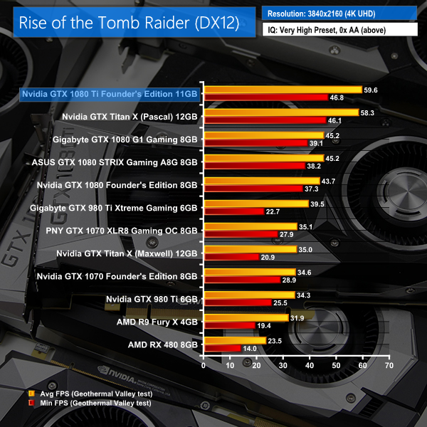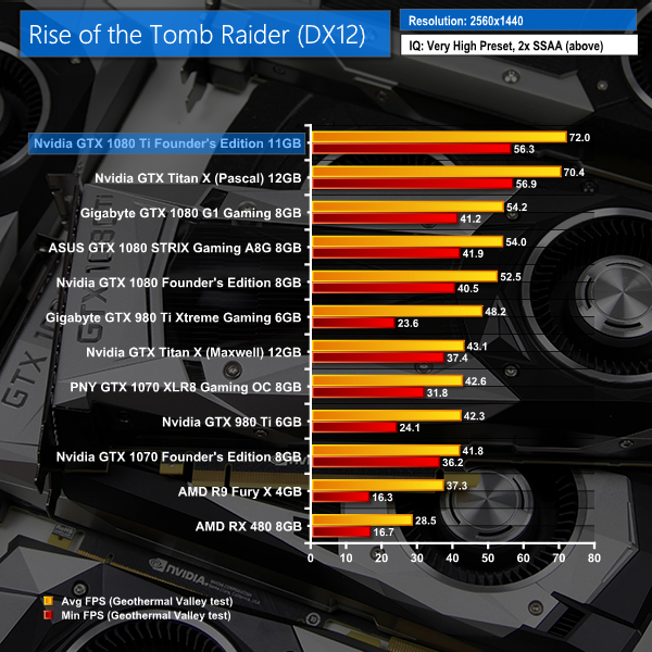 Another chart-topping display from the GTX 1080 Ti FE when it comes to Rise of The Tomb Raider in its DX12 mode. The game is playable at its highest – Very High – image quality settings at all three resolutions. You can even throw some SSAA into the mix at 1440P while maintaining an average above 60FPS on the GTX 1080 Ti.