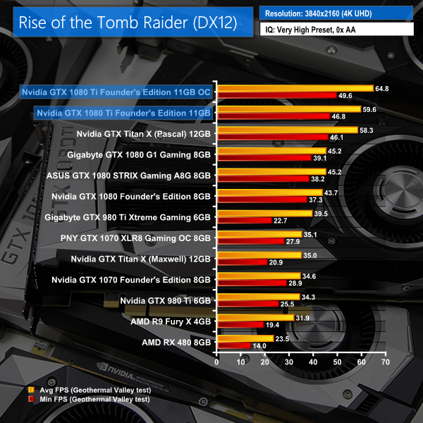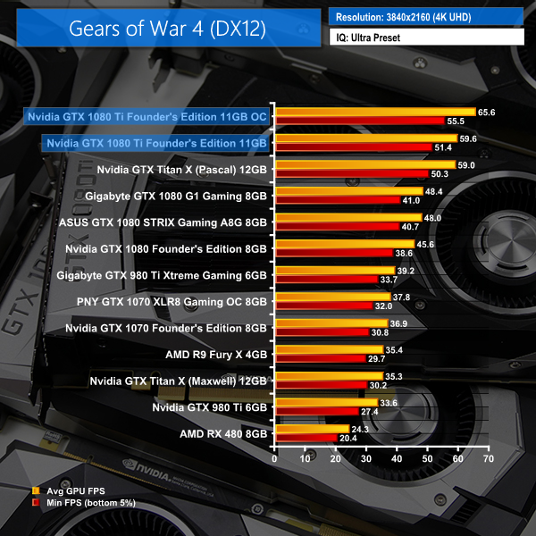 Overclocking the GPU core and GDDR5X VRAM resulted in a solid performance boost for the GTX 1080 Ti. Gears of War 4 saw a 10% up-tick and Rise of The Tomb Raider ran 9% faster.