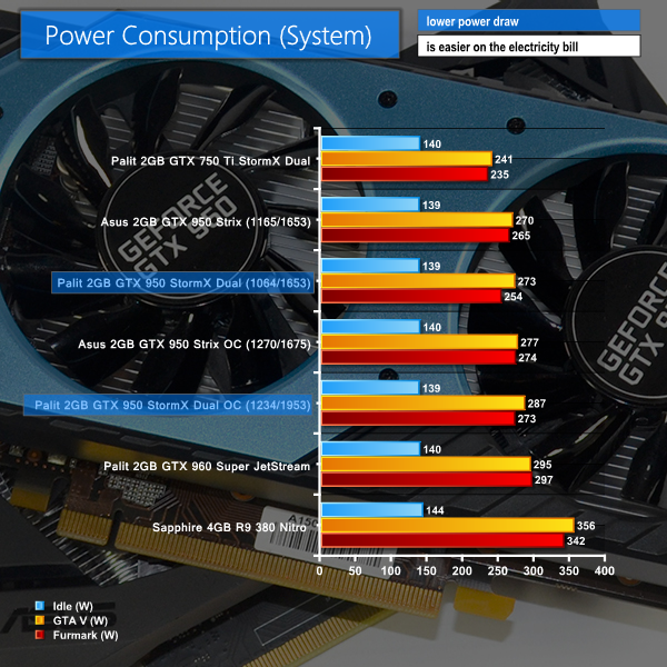 Power consumption of the Palit card is decent, although the electronics system does not seem to be quite as efficient as that used by Asus (albeit very marginally). The card drops its core voltage when Furmark is applied in order to protect the hardware.