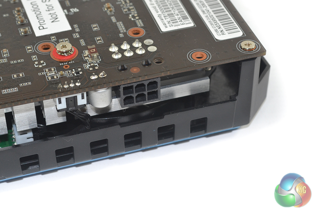 Palit extends the small PCB slightly past the 6-pin power connector in order to provide additional rigid mounting area for the dual-fan cooler.