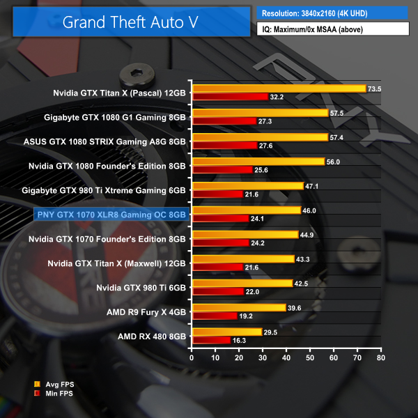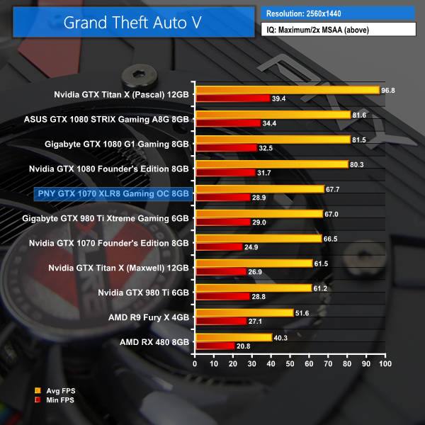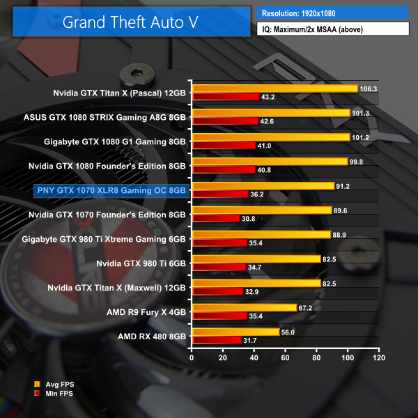 If you want to play GTA V maxxed out, PNY's GTX 1070 XLR8 OC graphics card is a good option for 1440P gamers and you can even throw 2x MSAA into the mix. If you are running a 4K screen, it would be wiser to reduce some of the quality settings in order to better target 60 FPS.
