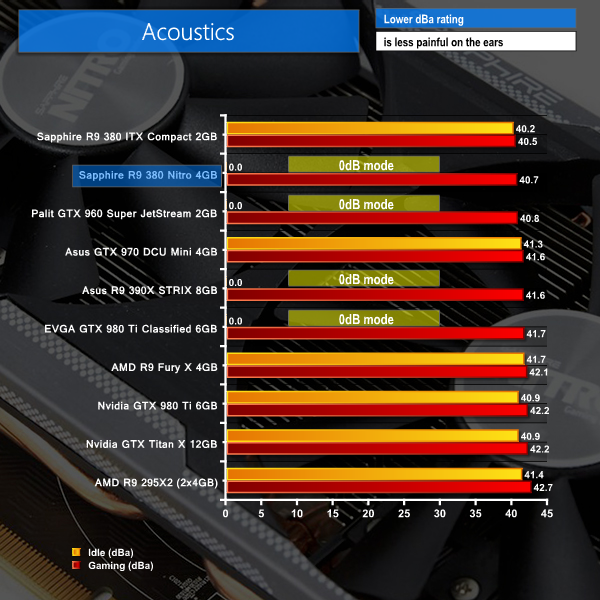 Sapphire's twin-fan cooler is inaudible over my background noise levels at a 1m test distance, even while playing GTA V with the fans operating at around 50%. Sitting close to the system does allow the small difference between the card's 0dB mode and its fan operating state to be detected, but the gaming noise levels are nowhere near the point of intrusiveness.