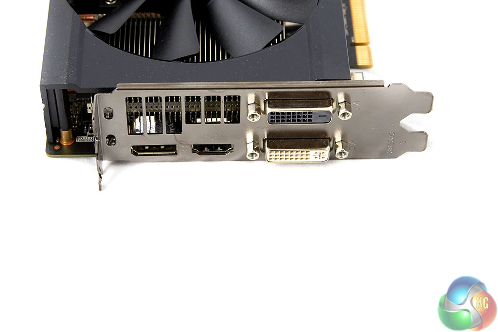 The card is equipped with two DVI ports, one DVI-I and one DVI-D. There is a full sized HDMI 1.4 and DisplayPort underneath an exhaust vent.