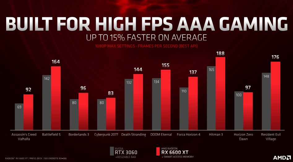 Compared to the RX 5600 XT, AMD's numbers show the RX 6600 XT delivering up to 1.7x more performance. Compared to the newer Nvidia RTX 3060, the RX 6600 XT trades blows in some titles, like Cyberpunk 2077 and Horizon Zero Dawn, but handily wins in other titles, like Hitman 3, Resident Evil Village and Assassin's Creed Valhalla. Do bear in mind these are first-party benchmarks, and we will need to run our own tests as part of our review, but they clearly show AMD taking the RTX 3060 head-on.