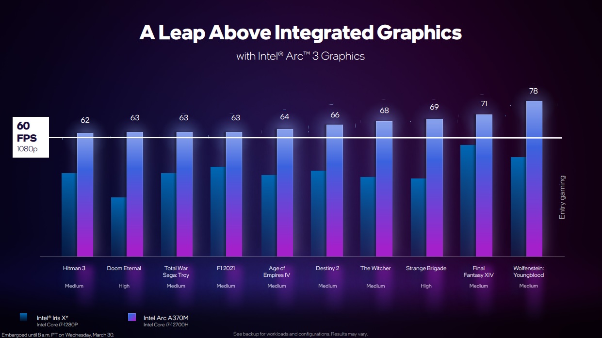 The Intel Arc A-series is designed for a range of laptop designs. For instance, the entry-level Arc 3 GPUs will be going straight to ultra-thin and light laptops. The Arc 5 and Arc 7 GPUs will be best served in bigger ‘gaming' and ‘creator' laptops with more capable cooling solutions. With Arc 3, Intel promises 1080p/60FPS gaming in popular titles – we've included a slide in the gallery below with Intel's internal Arc 3 benchmarks in titles like Doom Eternal, Hitman 3, Total War, Final Fantasy 14, Destiny 2 and others. Esports titles like Fortnite, Rocket League and Valorant are also said to be no-sweat for Arc 3 GPUs, offering over 90FPS at 1080p.