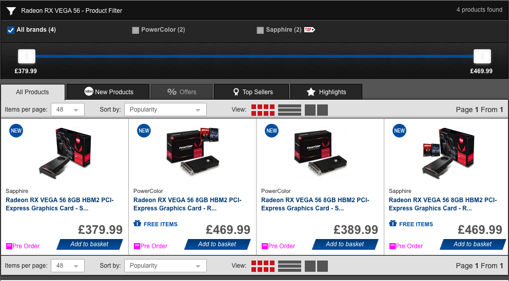 Hopefully this pricing sticks, though it is worth noting that Scan also has Vega56 preorder listings going for as much as £500, so price hikes could occur if stock shortages hit.