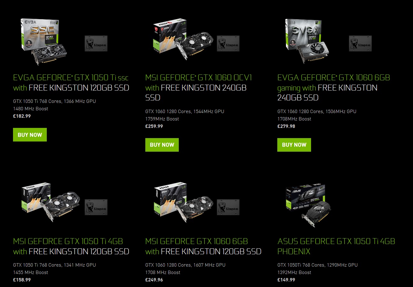 Nvidia kicked off the GPU/SSD bundle in the UK and Europe earlier this week. Essentially, if you pick up a GTX 1050Ti, you'll get a free 120GB SSD from Kingston and if you shell out for a GTX 1060, you'll get a 240GB SSD. Like always though, there are some caveats involved.