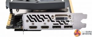 At one end of the card MSI has tacked on voltage check points for those users inclined towards the dark art of extreme overclocking. At the opposing end MSI offers a wide selection of Display outputs – two HDMI 2.0b, two DisplayPort 1.4 and one Dual-Link DVI-D. VR users should be well catered for with the dual HDMI.