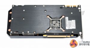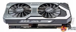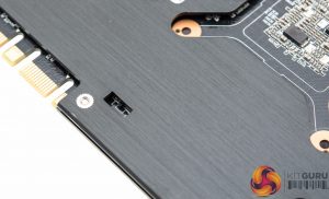 Palit implements a full cover metal backplate with a nice premium finish to it. Hidden within that backplate is the dual BIOS switch that toggles between a “standard mode” (Position 2) and “OC mode” (Position 1) UEFI. By default the graphics card will ship with the faster OC mode enabled to give the end user the best experience.
