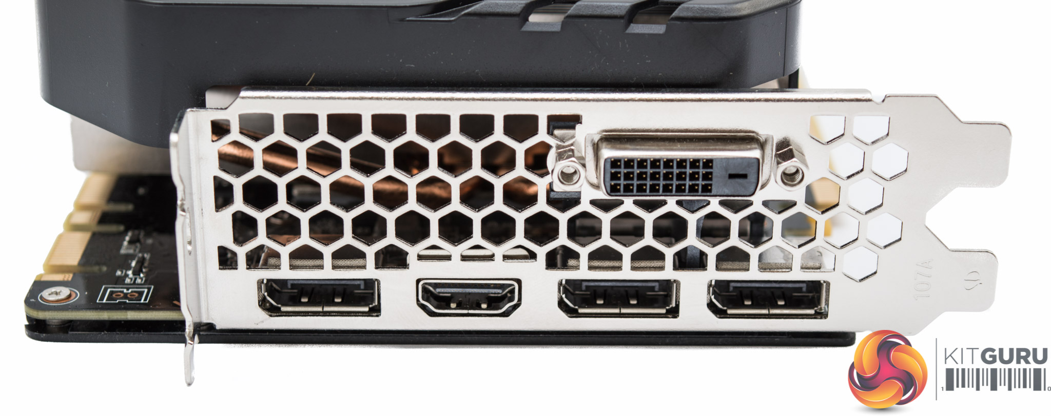 The rear I/O offers three DisplayPort 1.4, one HDMI 2.0b and dual-link DVI ports. The overall profile of the card exceeds two slots, it's somewhere between 2.5 and 3 slots in thickness, so for all intents and purposes this is a triple-slot card.