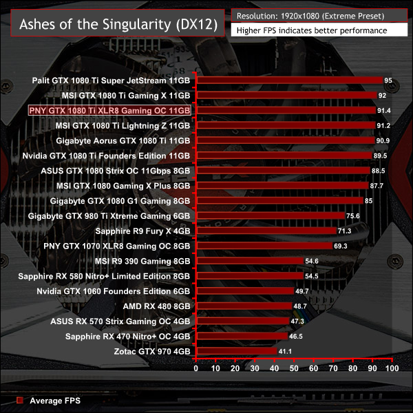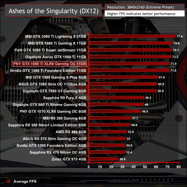 The PNY card seemed to struggle in Ashes of the Singularity. We're not sure if this reflects a thermal or power limitation or the increasing inconsistency of this game to benchmarking after a number of Steam updates.