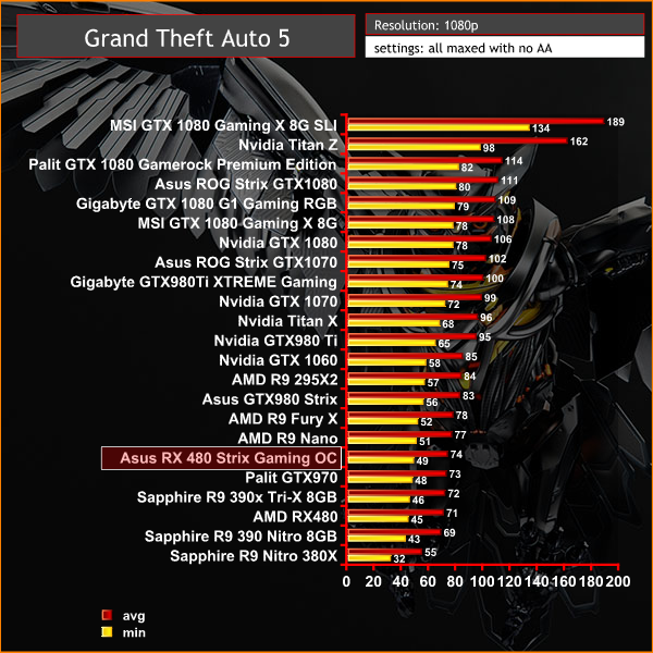 At 1080p, the Asus RX 480 Strix Gaming OC holds a small lead over the last generation GTX970, falling 3 frames per second behind the AMD R9 Nano.
