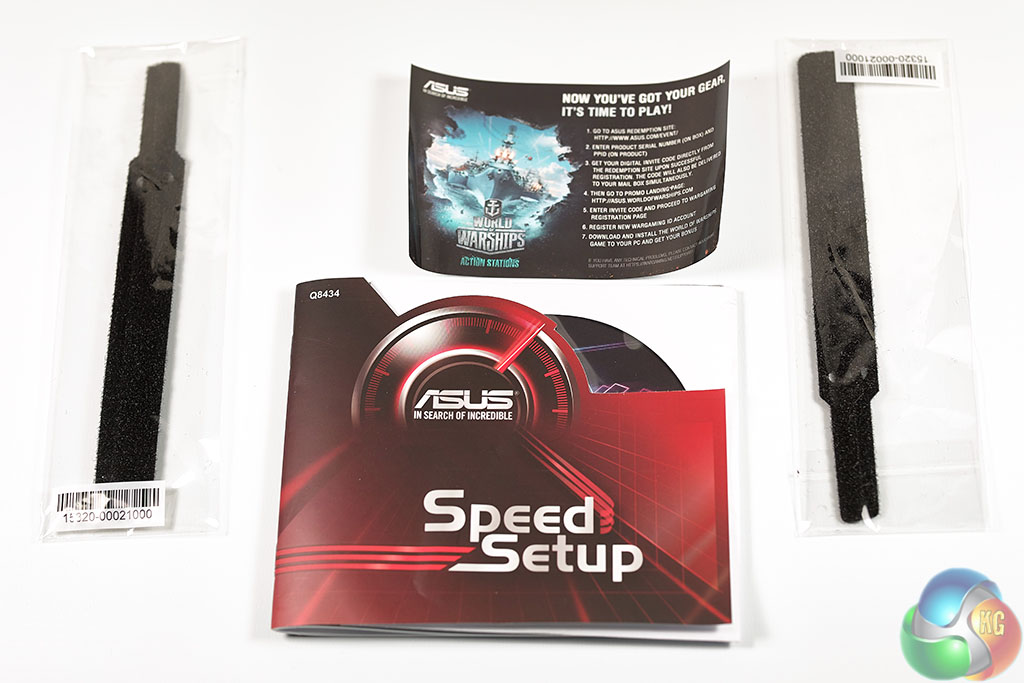 The card itself is protected beneath the peripherals box, sandwiched between thick layers of foam. The company include wristbands and literature on the card, including a software disc. We recommend you get the newest drivers from the AMD website. A quick visit to the Asus website will ensure you have the latest revision of GPU Tweak and the AURA Utility (to control the card lighting).