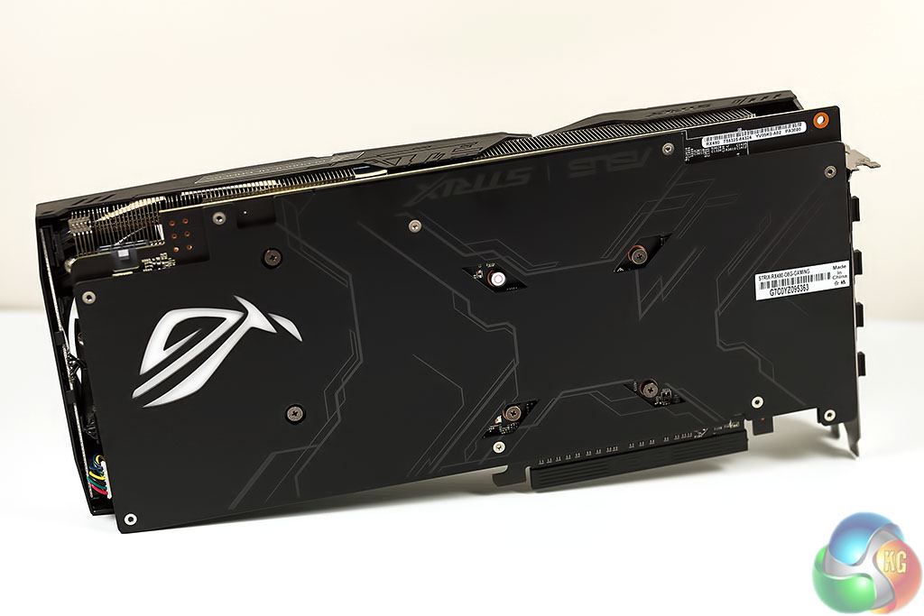 The backplate is beautifully engineered with the logo cut out, and fully able to glow in RGB during operation. The lighting is controlled by the software that is supplied with the card – called ‘AURA’. You are able to change lighting from static, to ‘breathing’, as well as ‘strobing’ and ‘colour cycle’ modes. A slider is positioned on the right of the interface which lets you select a colour from millions available. The ‘music’ option allows the card to pulse along with music you are playing at the time. the ‘GPU temperature’ option controls lighting based on the temperature of the card. so it changes from green when colder to red, when hot. I can’t see anyone feeling that ASUS cut corners here.