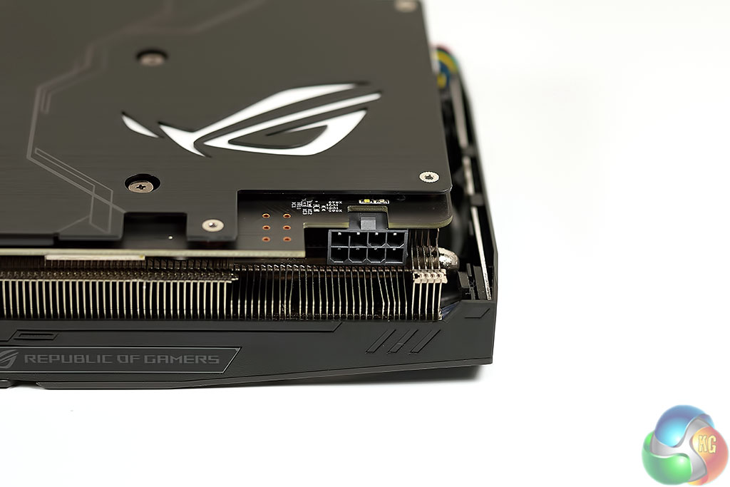 The Asus RX 480 Strix Gaming OC takes power from a single 8 pin PCIe power connector, shown above. The reference AMD RX 480 card takes power from a single 6 pin PCIe power connector.