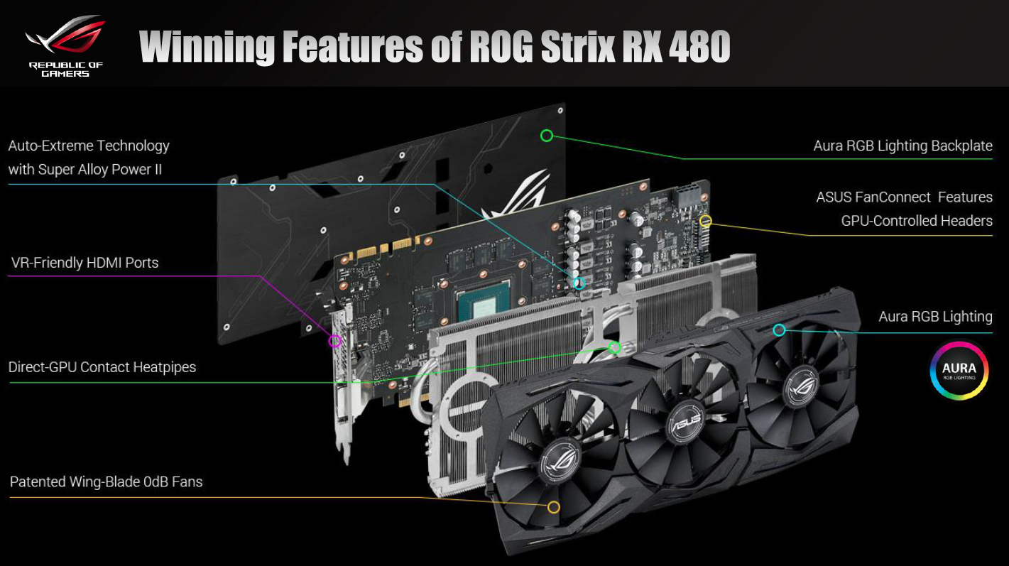The Asus RX 480 Strix Gaming OC is a triple fan cooler and much more substantial than the wimpy AMD reference card, featuring a cheap plastic shroud and single blower style fan. Asus have even equipped the card with a backplate.