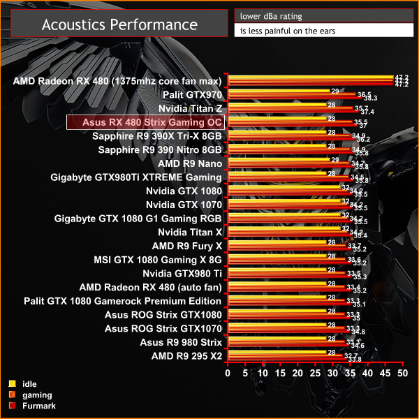 All our results on this page are taken from the Asus RX 480 Strix Gaming OC running with a target temperature of 65c – which is the setting that we got most times on a reboot. This is obviously louder, and cooler than a profile set 10c higher as the fans have to work harder.
