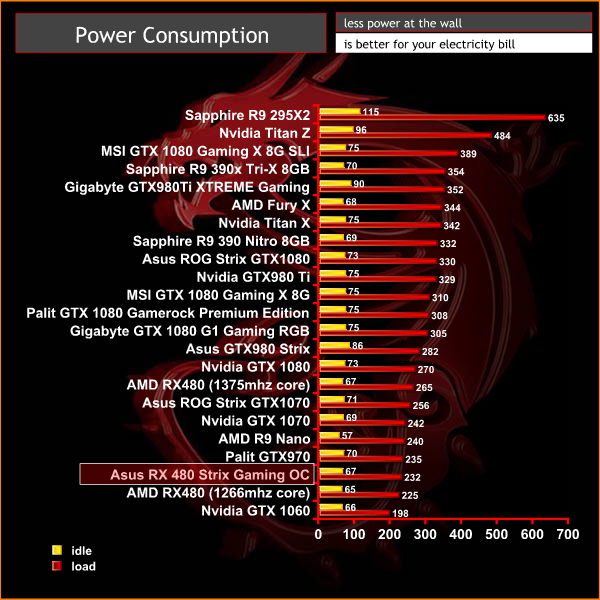 The Asus RX 480 Strix Gaming OC Aura is an efficient card. Under gaming load, the system power demand is 232 watts. With the reference GTX 1060 in the system however, the power drain drops to 198 watts. The Nvidia GTX 1060 consumes around 34 watts less when loaded.