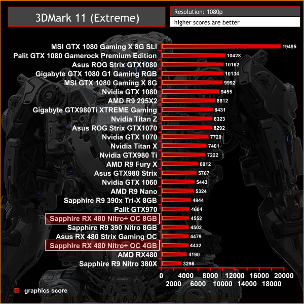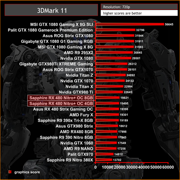 The Sapphire RX 480 Nitro + OC 4GB drops down a little in the graphs due to the reduced core and memory speeds. The 8GB version outperforms the Asus RX 480 Strix Gaming OC, and actually manages to claim a bit of a lead over the Sapphire R9 390X Tri-X 8GB from the last generation.
