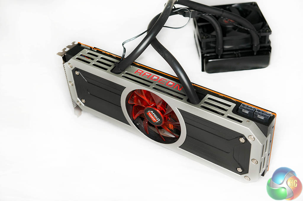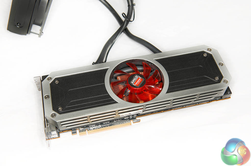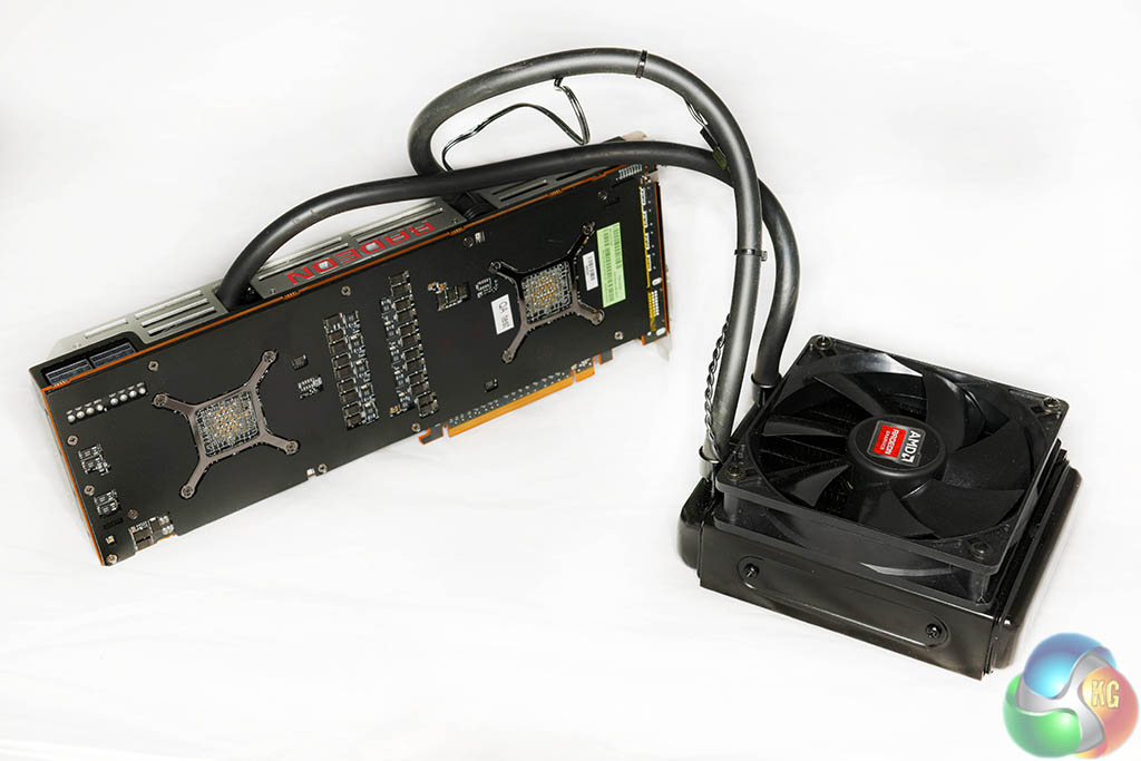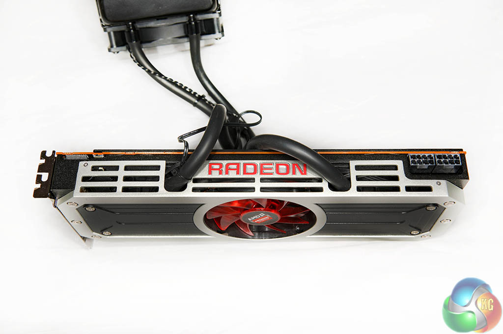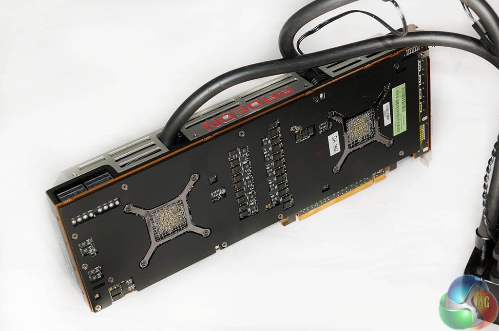 The two images above show the R9 295 X2 ‘layers' – with the cooler removed in various sections. The memory and VRM's are cooled by a copper heatsink with the fan pushing air directly overhead, and the dual Asetek blocks are installed over the GPU cores on either side of the PCB. The pumps are integrated into the cooling heads.
